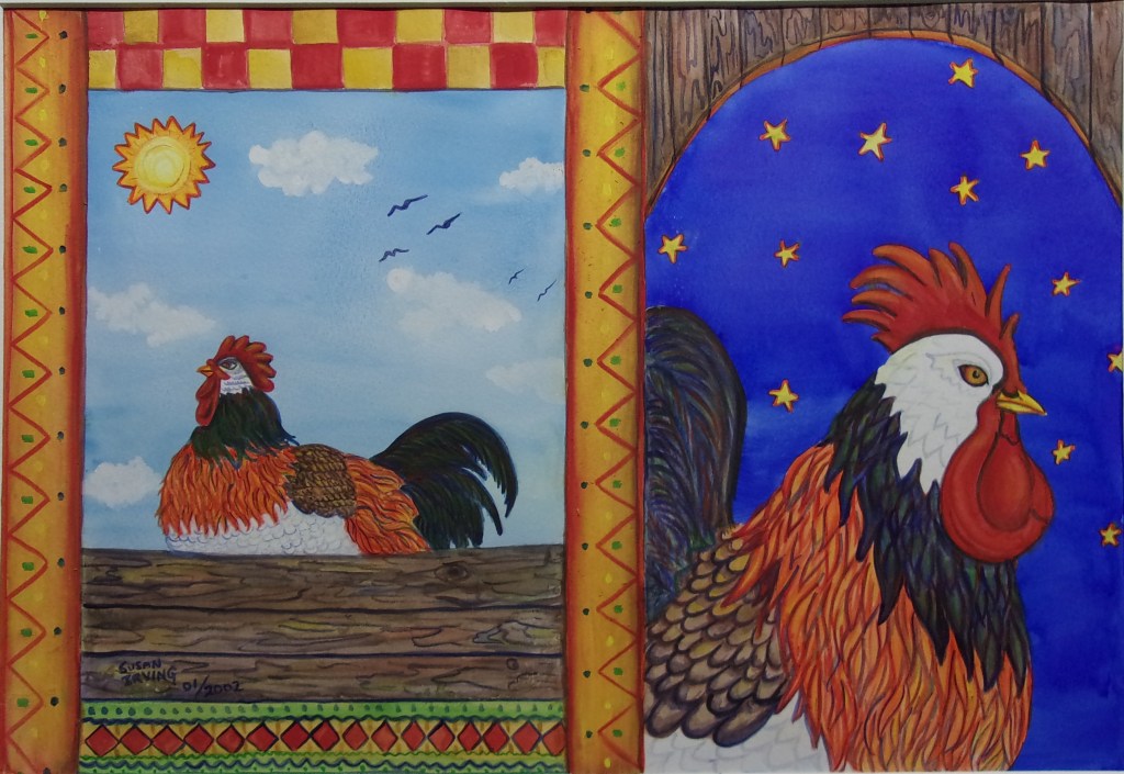 For the first one Chickens: Day and Night , watercolour 18 x 23, painted in 2002, I wanted the focus to be on the birds.