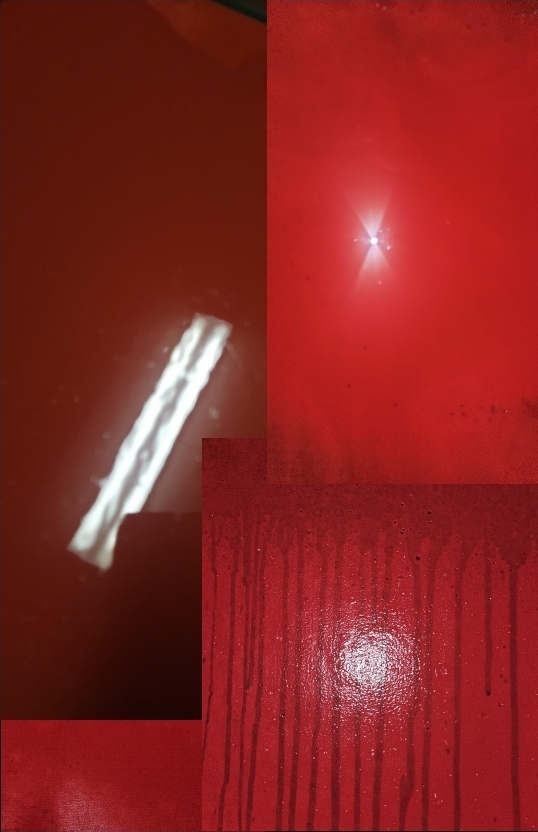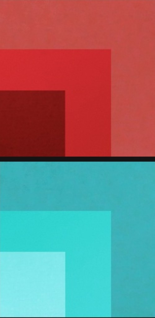 Above is a color template of my third work in this series through different stages of cure, angles, and lighting as well as a negative edit, taken to demonstrate the interaction of color- as per Josef Albers -with the qualities of layering and maximizing interactive values. [Josef Albers was a German-born American artist and educator, considered one of the most influential 20th-century art teachers in the United States. He is known for his work on colour theory. Ed.]