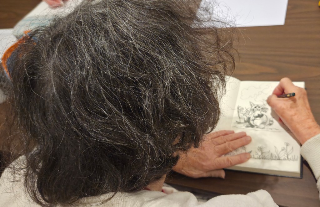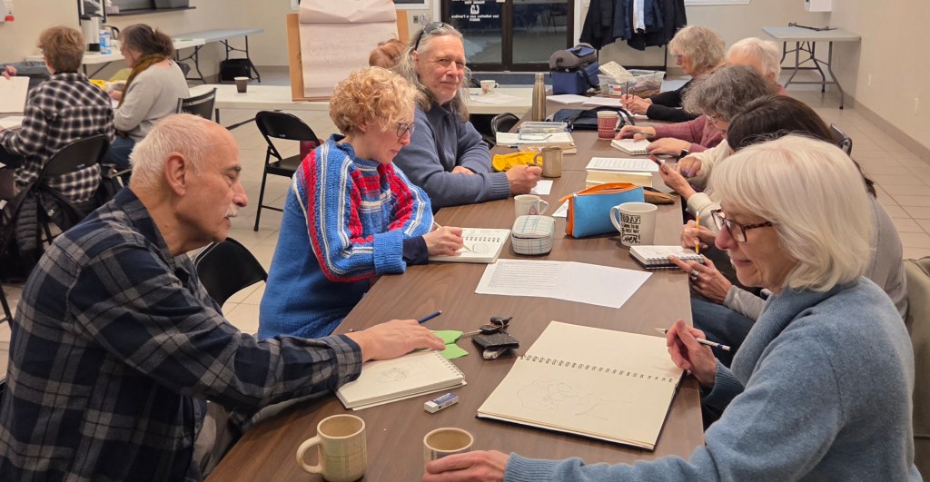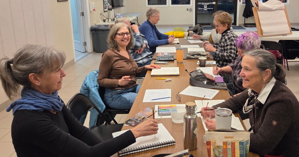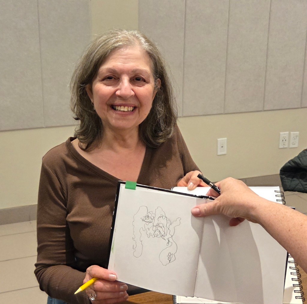 The 90-minute coffee house demonstrated many ways to draw. Folks learned that by giving up control – not lifting pencil, not looking at their drawing, not using the dominant hand – they could see better! And, as usual, they also had a great time.