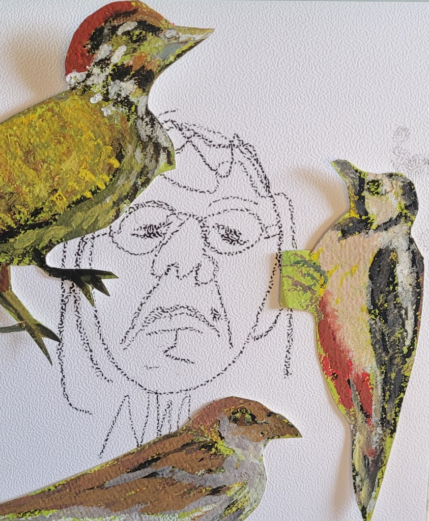 This is how I feel when asked to do something I’ve forgotten [promise of artwork, Ed.] in a hurry. I had cut the birds out of a sketch pad for collage. Haven’t done that either.