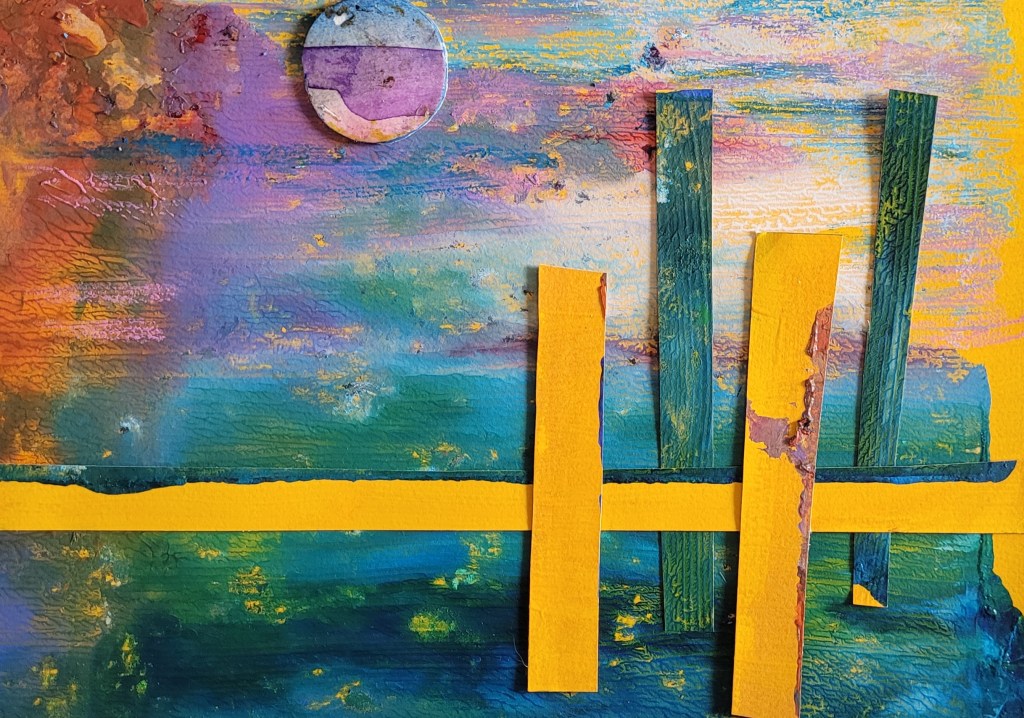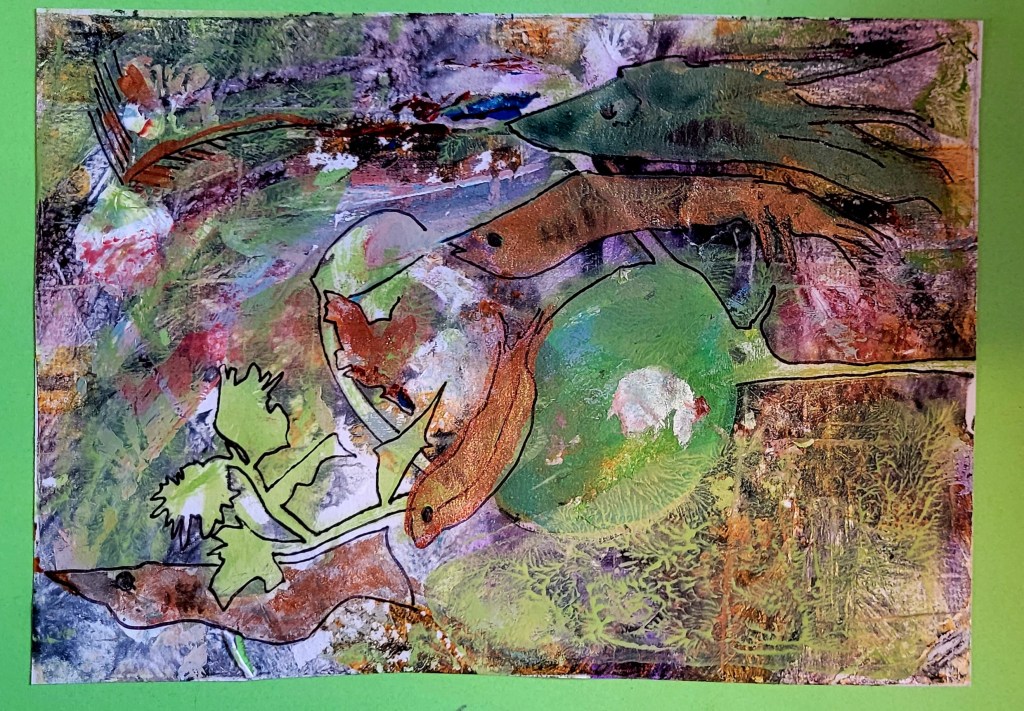 Searching through the collage papers for inspiration, I came across a failed print from last year. Looking at it this time, I saw fish.